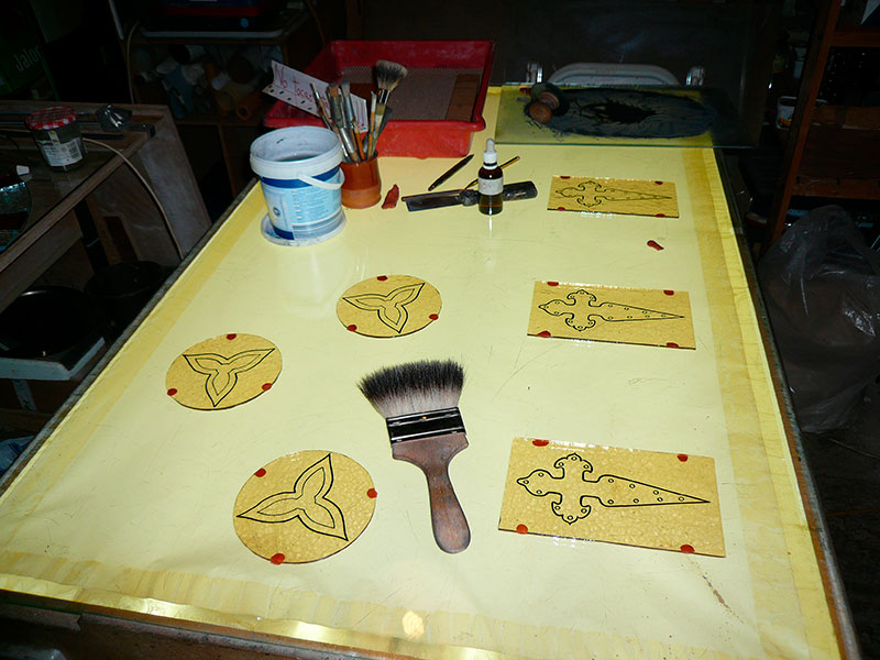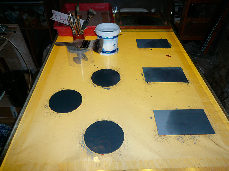 El sombreado se realiza al contrario que cuando un artista trabaja con lápiz sobre papel, es decir, se quita en lugar de añadir pintura. Aquí puede verse el proceso: En la primera foto puede verse la preparación de las piezas, ya pintadas y cocidas, colocadas sobre la caja de luz. En la segunda fotografía se ha aplicado una capa fina de pigmento, mezclado con agua, con un pincel hecho con pelo de tejón. Este tiene una flexibilidad particular que permite estirar la pintura sobre el cristal para dejarla uniforme y lisa.