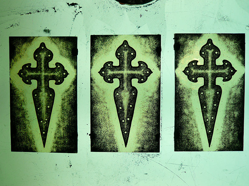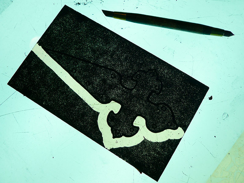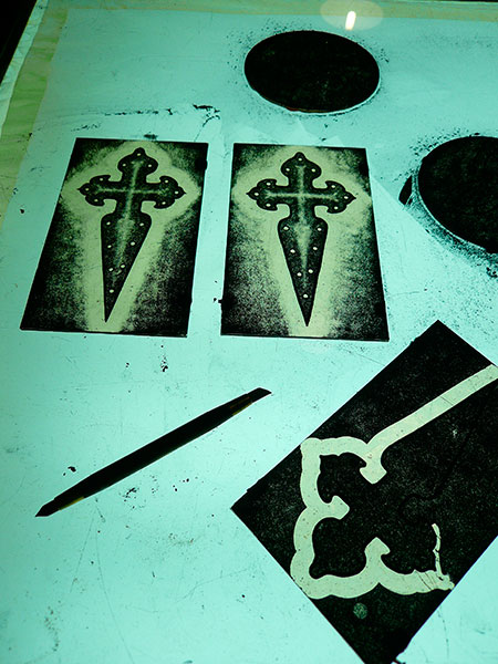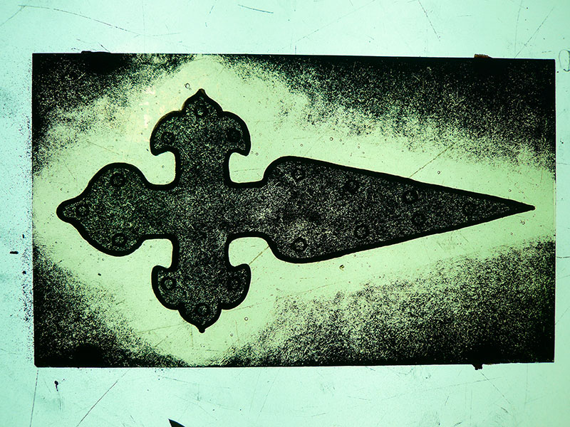 Una vez seca, la pintura se puede trabajar con pinceles y herramientas especiales (fotos 3, 4, y 5) para retirar pintura hasta que se consigue el efecto deseado. Hay que tener en mente que la pintura no se ve igual sobre la caja de luz que expuesta a la luz natural. Además, una parte de la pintura se gasta en la cocción, por lo cual hay que tener en cuenta que el tono va a ser más claro tras su paso por el horno (foto 6).